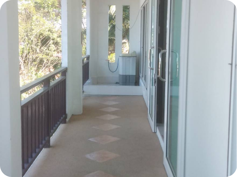 • ลานหน้าบ้านกว้างขวาง ด้านหน้าเป็นกำแพงกึ่งรั้ว ด้านหลังเป็นกำแพงก่อทึบ ประมาณ 1.5 เมตร และเสริมตะข่ายโครงเหล็ก